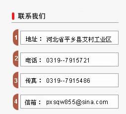 地址:河北省平乡县艾村工业区 电话:0319-7915721 传真:0319-7915486